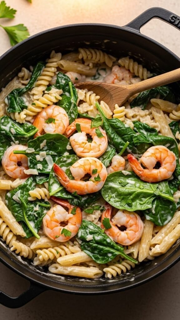 - In a skillet, sauté shrimp and wilt spinach. Combine with cream and cheeses, then stir in pasta.