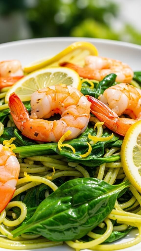 - In a skillet, melt butter, add shrimp until cooked, then stir in lemon juice, zest, and spinach.