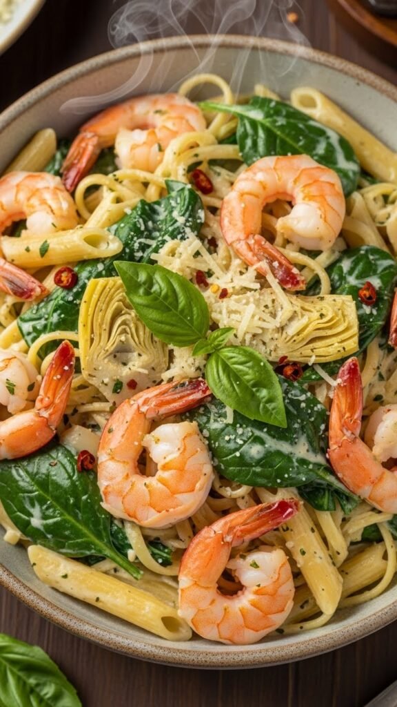 - In a pan, heat oil, add garlic, shrimp, and artichokes until shrimp is cooked. Stir in spinach and cream.