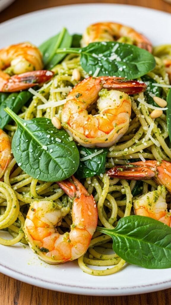 - In a pan, heat olive oil, sauté garlic, then add shrimp until pink. Pour in cream and spinach, stirring until spinach wilts.