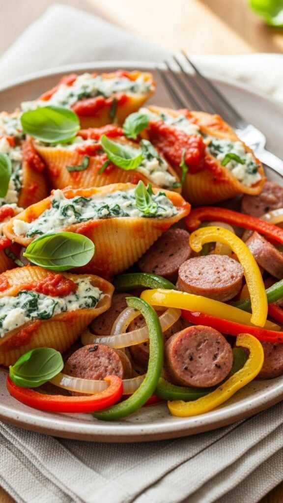 Spinach and Ricotta Stuffed Shells with Sausage and Peppers