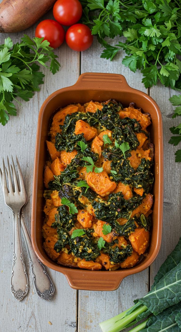 - Mix sweet potatoes, kale, ricotta, and garlic powder in a bowl. Pour into a greased baking dish.