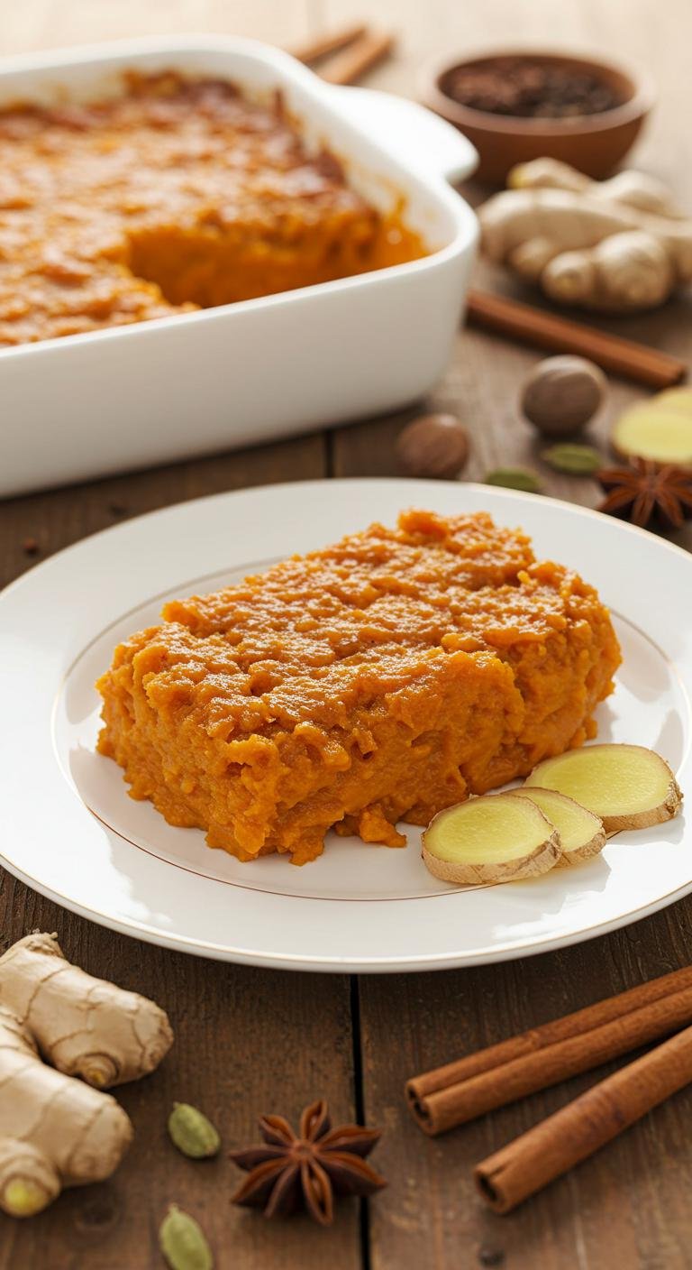 - Mix sweet potatoes with ginger, nutmeg, cream, and brown sugar. Pour into a baking dish.