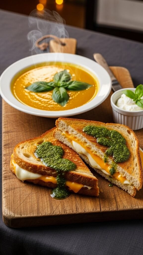 Roasted Tomato Basil Soup with Pesto Grilled Cheese
