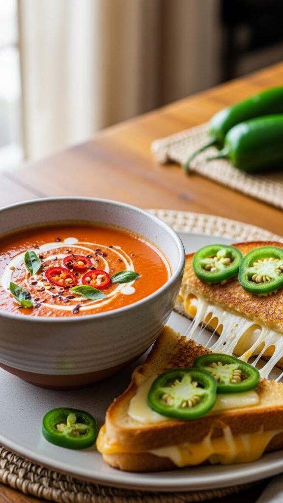 Spicy Tomato Soup with Pepper Jack Grilled Cheese