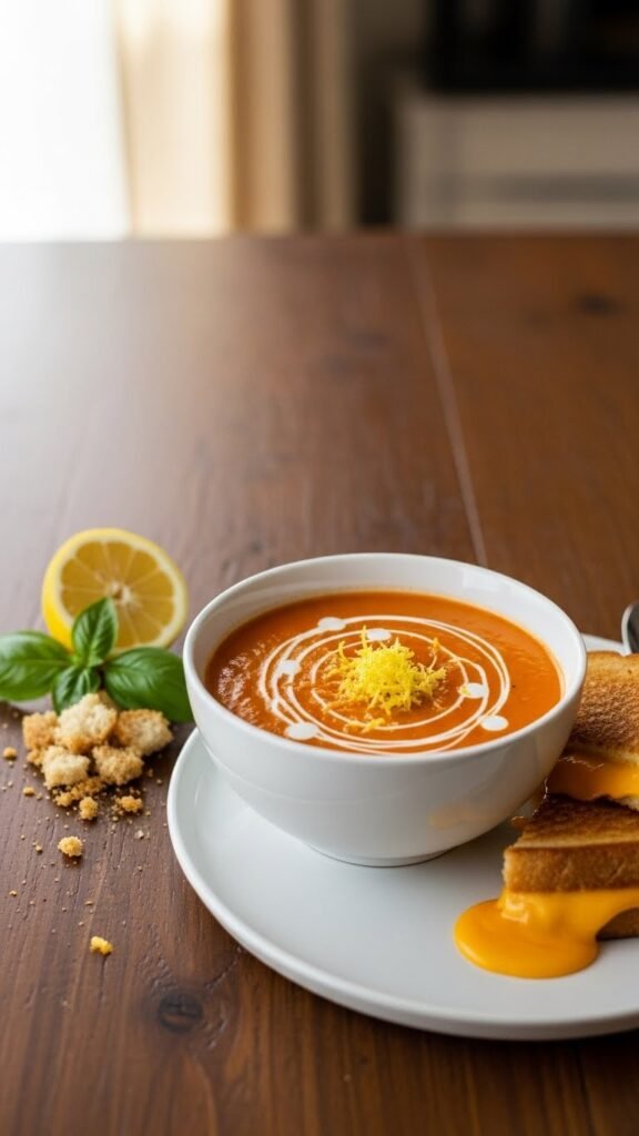 Tomato Basil Soup with a Twist of Lemon & Cheddar Sandwich