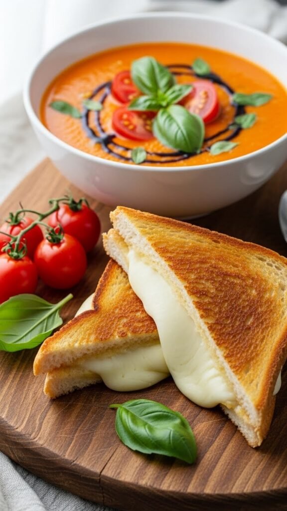 Caprese Tomato Soup with Toasted Mozzarella Sandwich