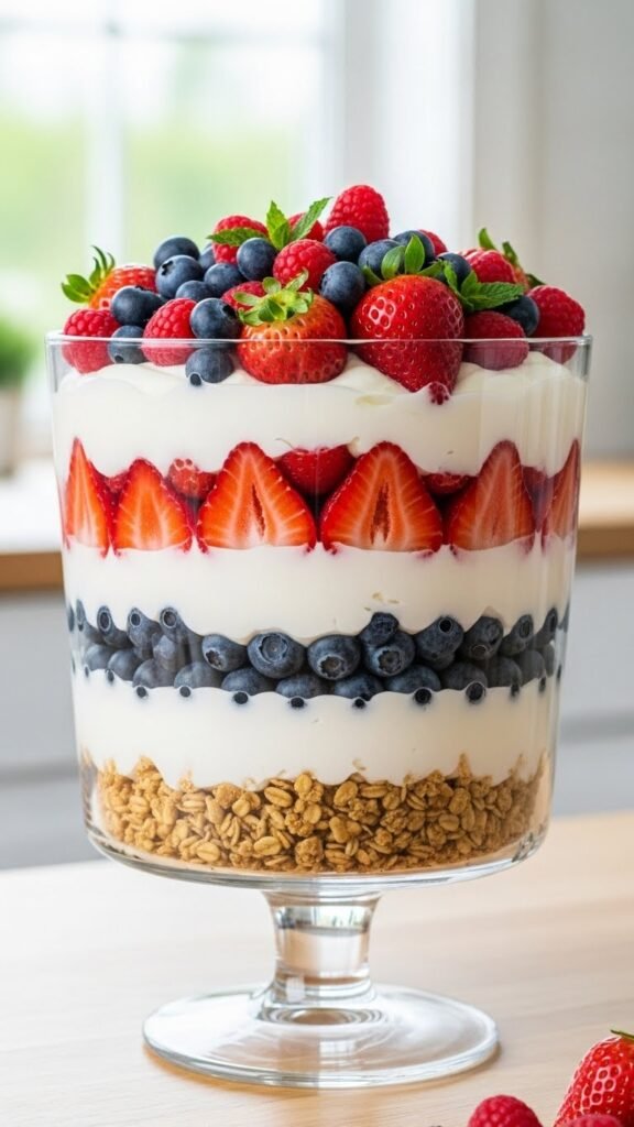 - In a trifle dish, layer Greek yogurt at the bottom, followed by a layer of mixed berries.