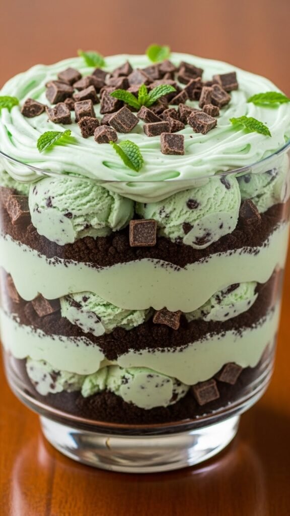- Add a layer of softened mint chocolate chip ice cream, followed by whipped cream.