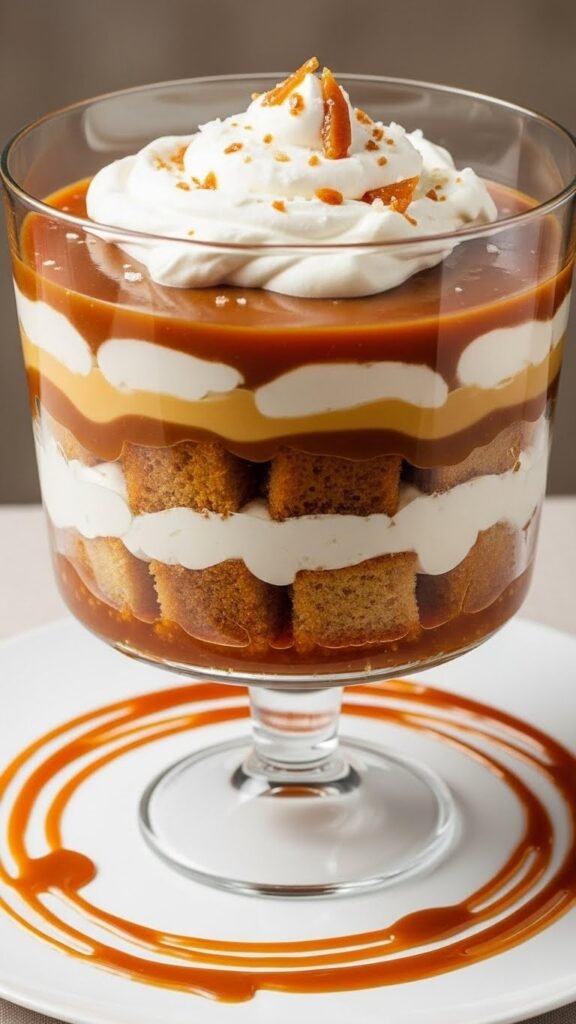 - Layer sponge cake cubes in the trifle dish and drizzle with salted caramel.
