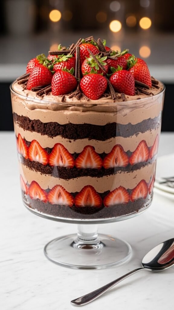 - Add a generous layer of chocolate mousse and then sliced strawberries.