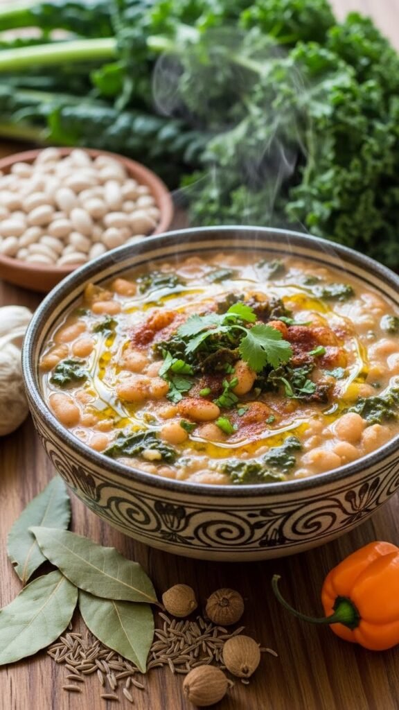 - Add beans, green tomatoes, kale, cumin, and broth. Stir everything together.