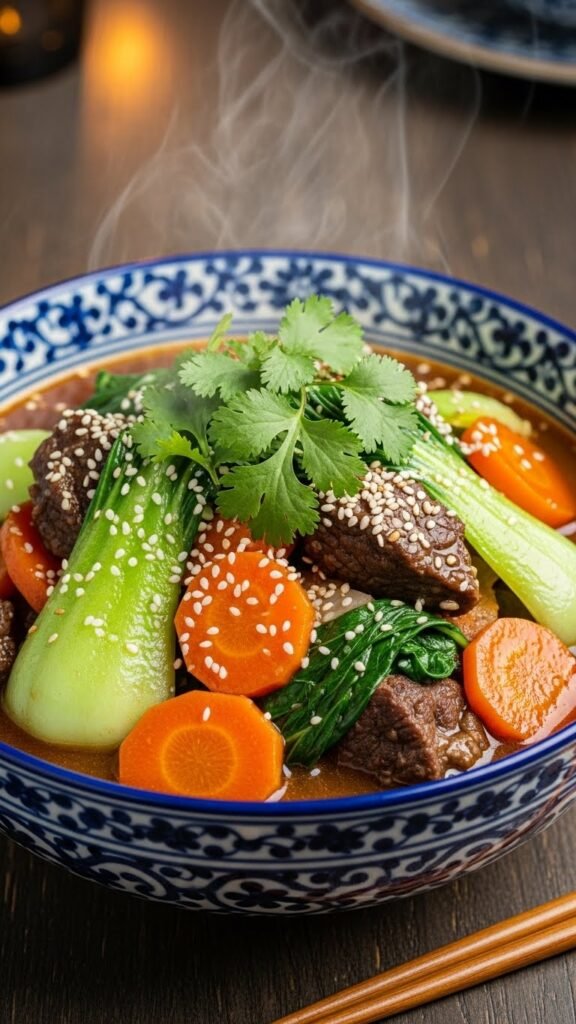 - Pour in beef broth, soy sauce, and vegetables; simmer for 1 hour.